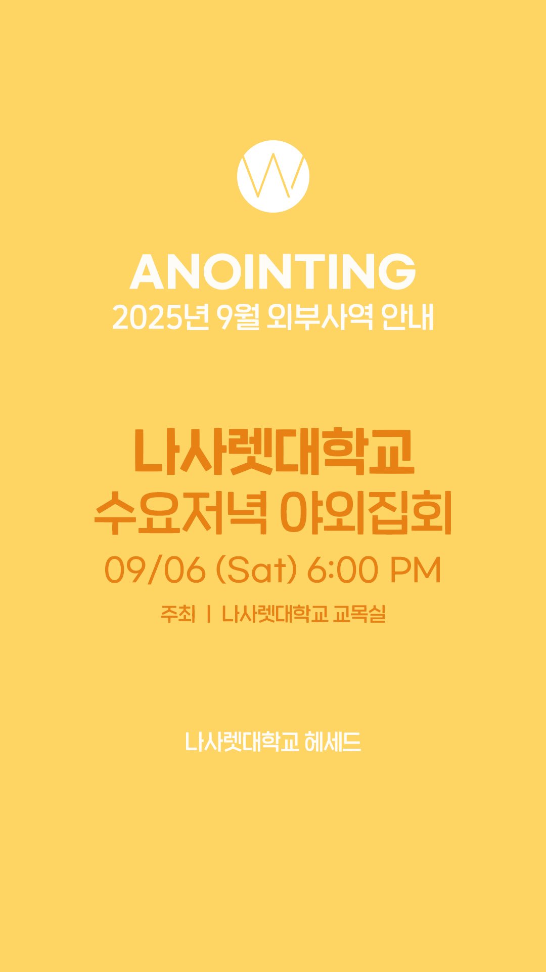 #어노인팅 #초청집회 #나사렛대학교 .2025.9.10.(수) 7:00 PM 주최 : 나사렛대학교 교목실장소 : 나사렛대학교 헤세드 (야외공연장)📍 충남 천안시 서북구 월봉로48*본 집회는 이미 진행된 예배입니다.