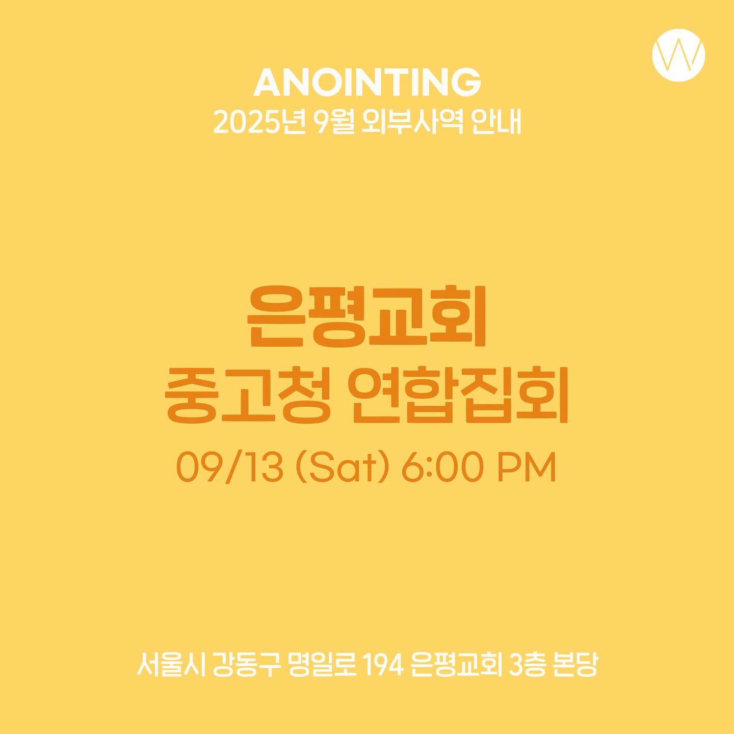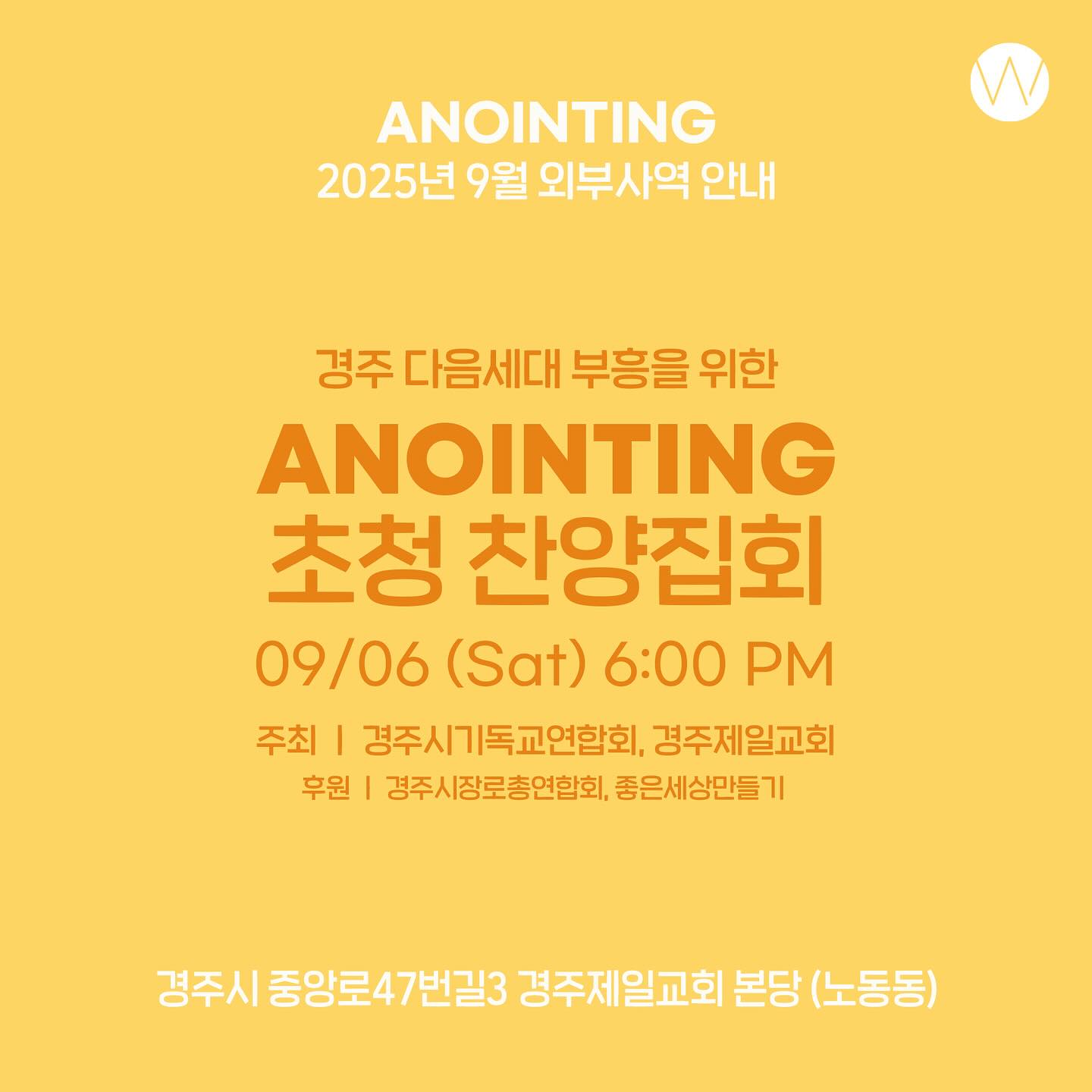 #어노인팅 #목요예배 #worship_together 𝟐𝟎𝟐𝟓년 𝟗월 예배 안내입니다. 𝟗월 𝟎𝟒일ㅣ예배인도 소병찬 간사ㅣ설교 정민영 선교사𝟗월 𝟏𝟏일ㅣ예배인도 양민호 간사ㅣ설교 김영석 목사𝟗월 𝟏𝟖일ㅣ예배인도 강슬기 간사ㅣ설교...