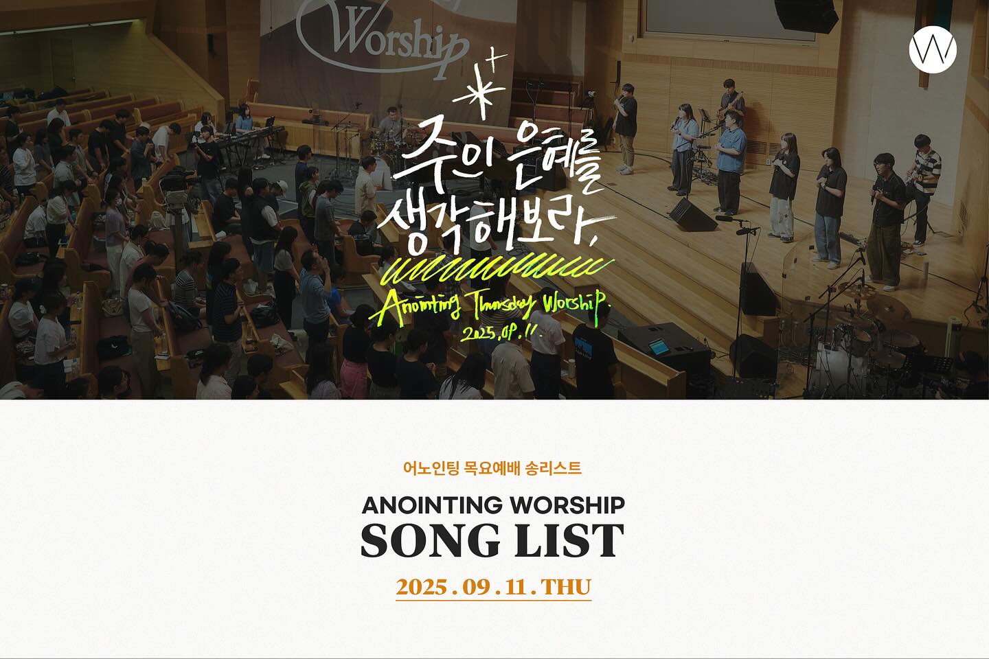 #어노인팅 #목요예배 #20250911 #Anointing_Thursday_Worship #Songlist 예배인도_양민호 간사 [광고] ■ 2025년 𝟗월 예배 : 𝟎𝟒일 / 𝟏𝟏일 / 𝟏𝟖일 / 𝟐𝟓일■ 𝐀𝐧𝐨𝐢𝐧𝐭𝐢𝐧𝐠 정규 14집 발매 2025년 9...