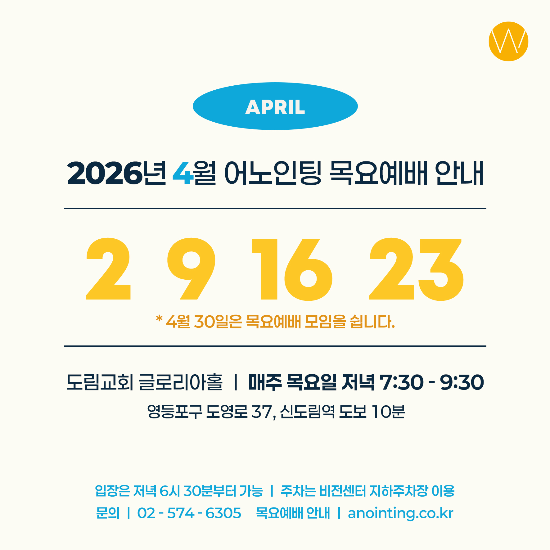 2026년 4월 어노인팅 목요예배 안내