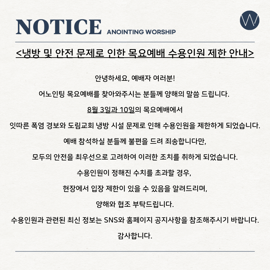 냉방 및 안전 문제로 인한 목요예배 수용인원 제한 안내